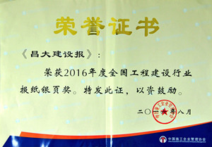 &On August 5, 2016, China Construction Enterprise Management Association held the annual communication work meeting to commend the relevant awards. 63 newspapers in the industry, including Changda construction news, won the "silver page Award". This is also the honor that the group has won for many years in a row.