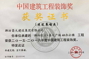 &On December 23, 2016, the 2015-2016 China Construction Engineering Decoration Award Ceremony was held in Beijing International Convention Center. The group won four more decoration awards, namely, the curtain wall decoration Award for the 4 × office building project of Dongfang Changda square constructed by the decoration curtain wall company, the Public Building Decoration Award for the 4 × office building of Dongfang Changda square constructed by the decoration company of iris port, the financial development Jiayuan residential building project constructed by the decoration company of iris port, the Public Building Decoration Award for the construction of the decoration company of iris port, and the Public Building Decoration Award for the construction of the decoration company of iris port The financial development Jiayuan residential building project also won the decoration award of public building decoration design. &China Architectural Engineering Decoration Award is the highest honor of the national architectural decoration industry, sponsored by China Architectural Decoration Association, which is evaluated annually and awarded every two years. The realization of four decoration awards in two years and one recognition cycle is the strength of "Changda decoration" brand, and also the realistic portrayal of the concept of "engineering excellence" and "building makes life better" gradually implemented by Weifang Changda construction group.