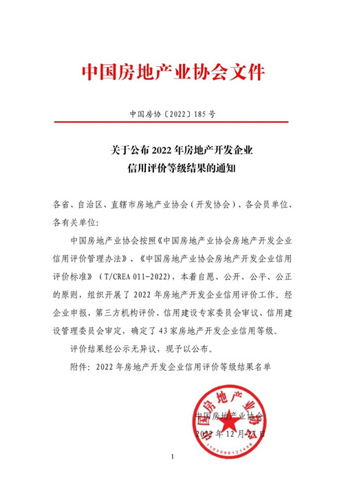 2022年12月27日,中國房地產(chǎn)業(yè)協(xié)會公布了2022年全國房地產(chǎn)開發(fā)企業(yè)信用評價等級結(jié)果,全國43家房地產(chǎn)開發(fā)企業(yè)經(jīng)嚴格、公正評審后獲評信用等級。集團泰和置業(yè)榮獲此次信用評價的最高等級——AAA級,這也是泰和置業(yè)繼2016年、2019年獲評AAA級后,再次獲得國家權(quán)威機構(gòu)的肯定。作為衡量一家企業(yè)綜合實力的重要指標(biāo),企業(yè)AAA信用評級具有極高“含金量”。依據(jù)對評估對象的信用紀錄、履約能力、經(jīng)營狀況以及專家實地核驗等多項指標(biāo)的科學(xué)評估與認證,企業(yè)信用等級越高,代表其經(jīng)營狀況、履約行為、信用紀錄越良好,是對企業(yè)信譽建設(shè)的高度認可。企業(yè)信用評級證書有效期3年,中房協(xié)委托評價機構(gòu)對有效期內(nèi)企業(yè)每年進行信用動態(tài)監(jiān)測。 信用是企業(yè)寶貴的無形資產(chǎn),也是企業(yè)的誠信名片和市場通行證。泰和置業(yè)多次獲評最高信用等級,充分體現(xiàn)了泰和置業(yè)在誠信經(jīng)營方面的重視與堅守,以“品質(zhì)”為基石,嚴格把控產(chǎn)品規(guī)劃設(shè)計、建設(shè)、銷售和服務(wù)的各個環(huán)節(jié),精于勤,作于細,方寸之間,匠心盡顯。同時也說明,集團各參建單位在統(tǒng)一協(xié)調(diào)配合等方面出色和卓越的工作。