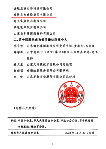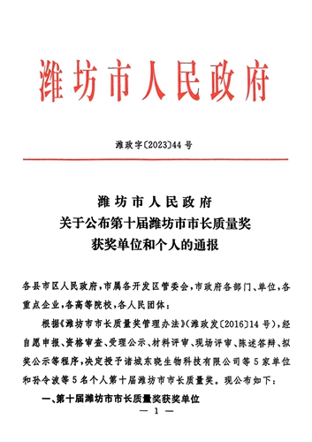 2023年11月27日,濰坊市人民政府公布了第十屆濰坊市市長(zhǎng)質(zhì)量獎(jiǎng)獲獎(jiǎng)名單,根據(jù)《濰坊市市長(zhǎng)質(zhì)量獎(jiǎng)管理辦法》(濰政發(fā)〔2016〕14號(hào)),經(jīng)自愿申報(bào)、資格審查、受理公示、材料評(píng)審、現(xiàn)場(chǎng)評(píng)審、陳述答辯、擬獎(jiǎng)公示等程序,集團(tuán)公司榮獲第十屆濰坊市市長(zhǎng)質(zhì)量獎(jiǎng)。