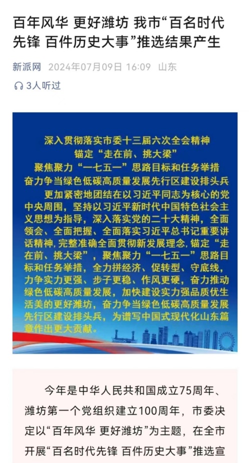 他們是躬身改革發(fā)展一線,干在實(shí)處,走在前列,事跡突出,先鋒模范作用明顯,充分展現(xiàn)了廣大黨員干部敢于擔(dān)當(dāng)、勇于創(chuàng)新、奮發(fā)有為、創(chuàng)先爭優(yōu)、實(shí)干奉獻(xiàn)的精神風(fēng)貌,凸顯了基層黨組織強(qiáng)化黨建引領(lǐng)、增強(qiáng)政治功能和組織功能、提升凝聚力戰(zhàn)斗力的堅(jiān)強(qiáng)作用。百年歷史大事則是濰坊第一個(gè)黨組織建立百年來在不同歷史時(shí)期對濰坊發(fā)展具有重要影響、重大作用的大事件。