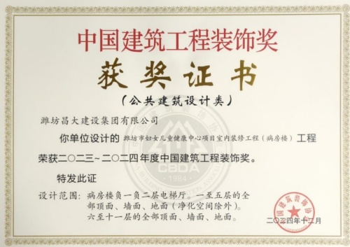 2024年12月10日,中國建筑裝飾協(xié)會在北京召開大會,表彰2023~2024年度“中國建筑工程裝飾獎”工程。集團裝飾幕墻工程公司、山東鳶港裝飾工程有限公司的三項工程榮獲五個獎項:濰坊醫(yī)學院附屬醫(yī)院教學科研病房綜合樓(建筑幕墻類和幕墻設計類)、濰坊市婦女兒童健康中心病房樓(公共建筑裝飾類和公共建筑裝飾設計類),柒星國際2#住宅樓(建筑幕墻類)。